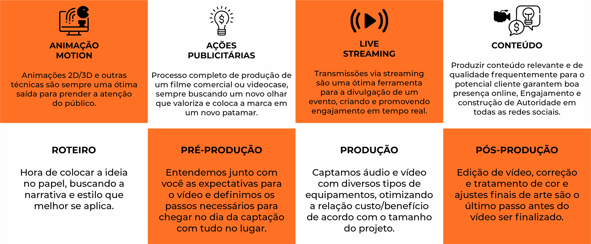 Atuando em diferentes nichos, oferecemos soluções rápidas com baixo custo de produção e com elevado nível de qualidade em filmes, mídias e conteúdos digitais para campanhas publicitárias, negócios e eventos corporativos.